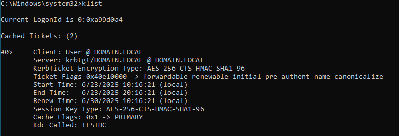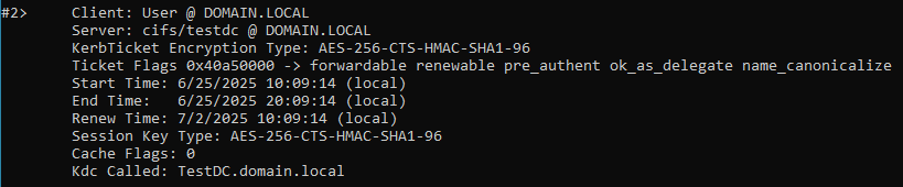 The TGT in this example was issued for the user “user@domain.local” by the KDC “TESTDC” – the Domain Controller of this Domain. It uses AES-256 encryption, is forwardable, renewable, and valid from 6/23/2025 10:16:21 to 6/23/2025 20:16:21, with a renewal deadline of 6/30/2025.