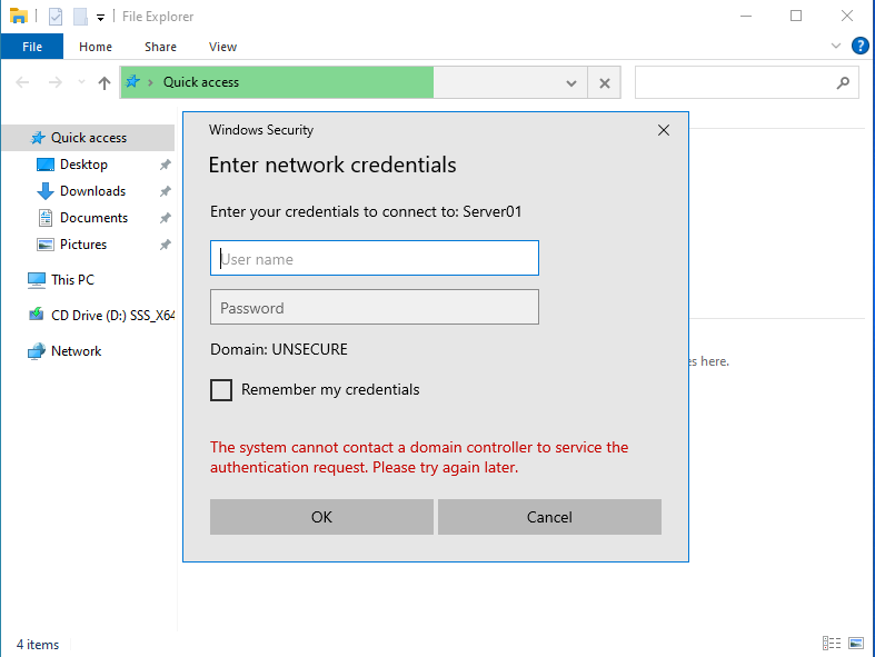 When trying to connect to “\\Server01”, Responder prompts for credentials via SMB: