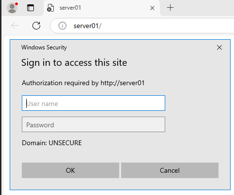When trying to connect to “http://Server01”, Responder prompts for credentials via HTTP: