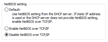 Once this has been determined, NBT-NS can be disabled. Since NetBIOS over TCP/IP (NBT) is configured individually for all network adapters, there are two main approaches depending on how the machine obtains its IP address.